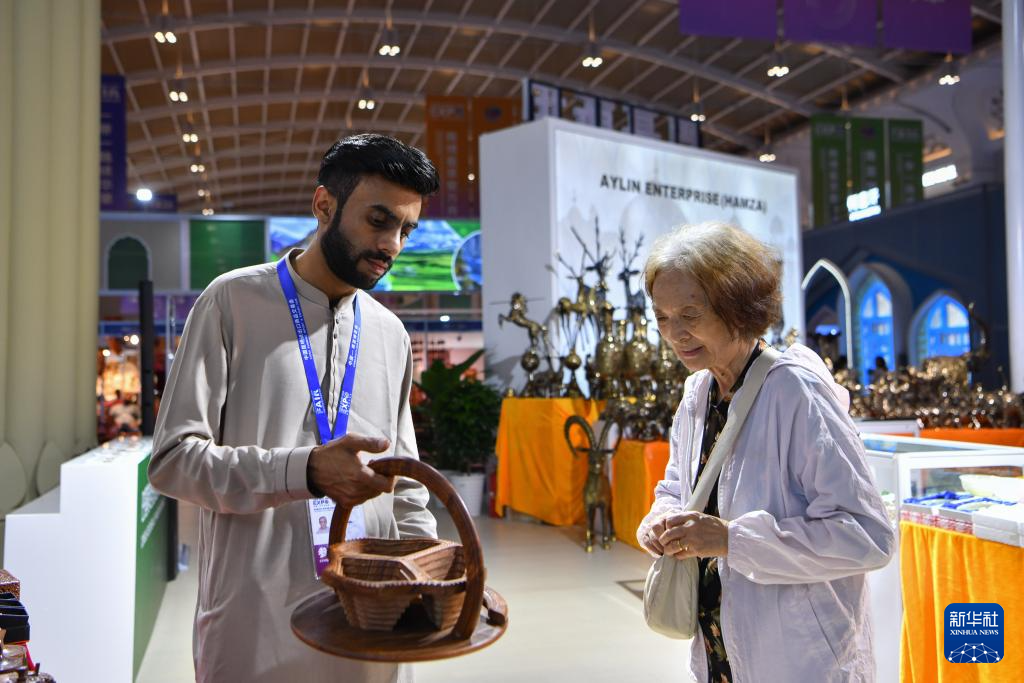 7月23日,巴基斯坦展區的展商向一名顧客推介特色商品。新華社記者 劉蓮芬 攝