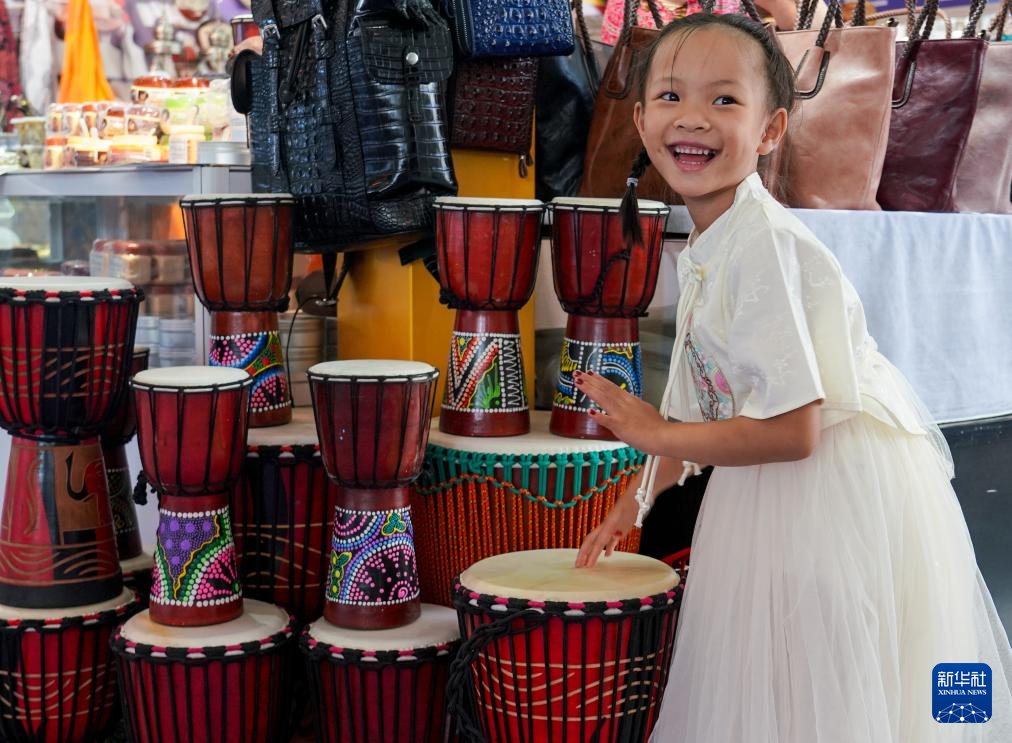 7月23日,小朋友在加納展區體驗非洲手鼓。新華社記者 王靜頤 攝