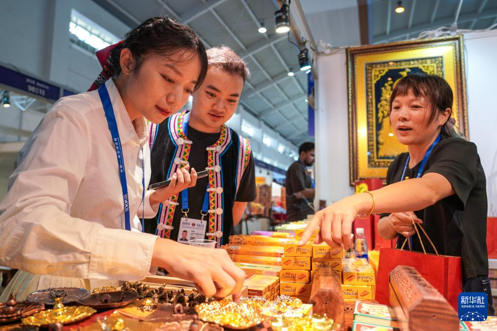7月23日,兩名女士在第八屆中國—南亞博覽會南亞館挑選特色商品。新華社記者 劉蓮芬 攝