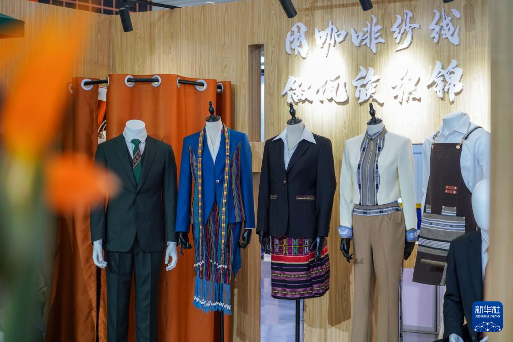 7月23日,在第八屆中國—南亞博覽會咖啡產業館的西盟佤族自治縣織錦服飾展區,紡織原料取材自咖啡渣的佤族織錦服飾正在展示。新華社記者 王靜頤 攝