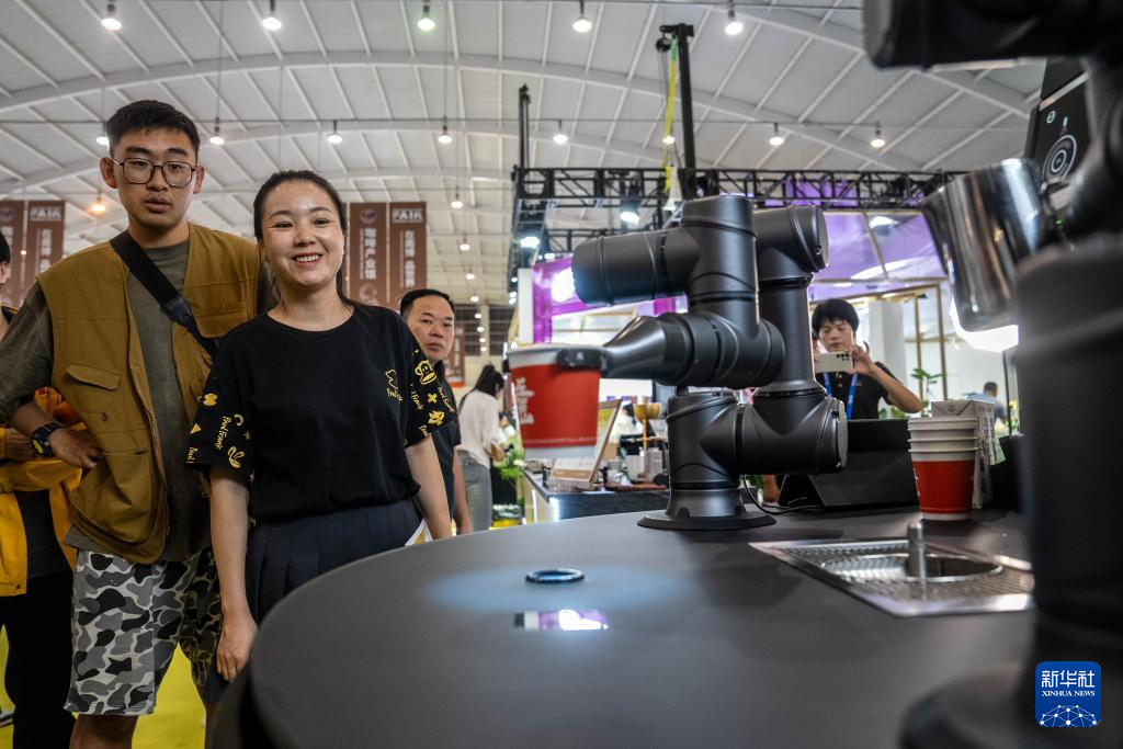 7月24日,在第八屆南博會咖啡產業館,觀眾在觀看咖啡機器人制作咖啡。新華社記者 胡超 攝