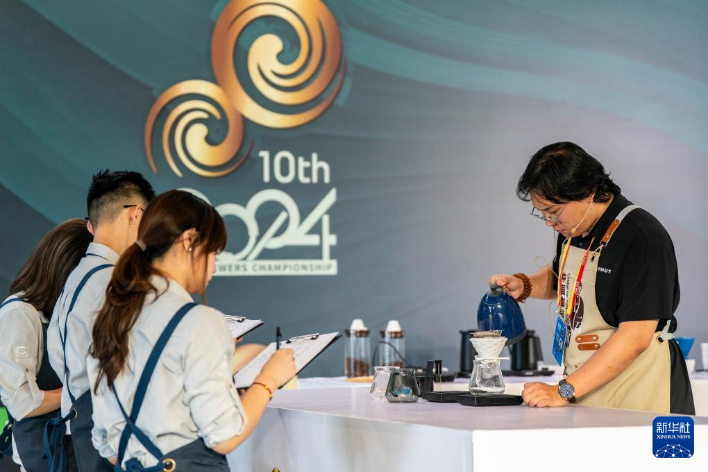 7月24日,在第八屆南博會咖啡產業館,一名選手在咖啡沖煮大賽上沖泡咖啡。新華社記者 胡超 攝