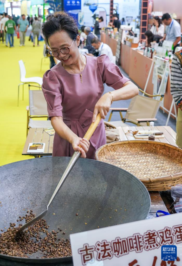 7月24日,參觀者在咖啡產業館里體驗炒咖啡豆。新華社記者 王靜頤 攝
