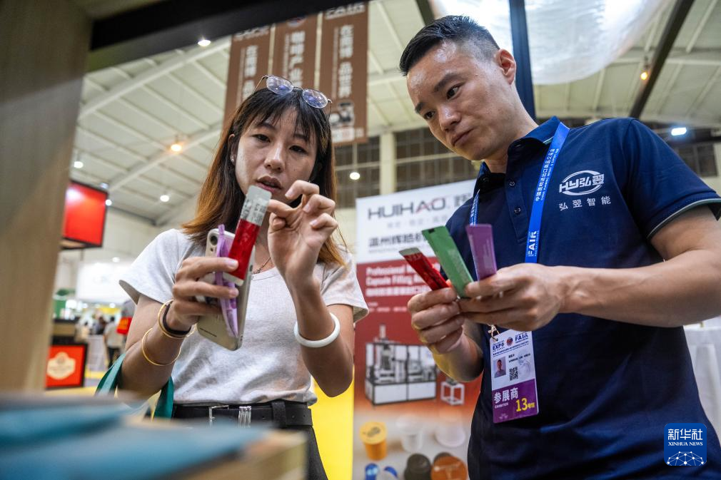 7月24日,在第八屆南博會咖啡產業館,一名買家向展商咨詢咖啡包裝設備。新華社記者 胡超 攝