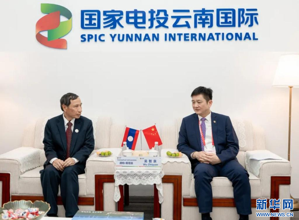 7月23日,老撾人民民主共和國能源與礦產部副部長通帕·英塔翁與云南國際黨委書記、董事長吳智泉座談。(國家電投云南國際供圖)