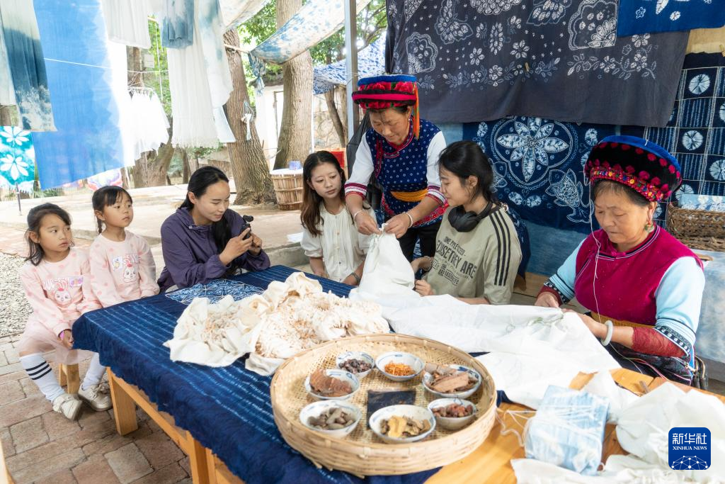 7月24日,來自新疆的游客在蝴蝶泉景區體驗非遺項目“白族扎染”。新華社記者 劉蓮芬 攝