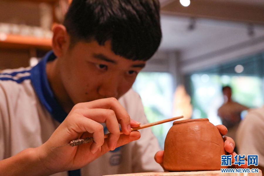 7月28日,學生在云南省西雙版納傣族自治州景洪市一家傣陶廠學習傣族慢輪制陶。