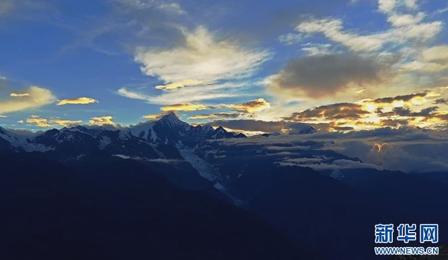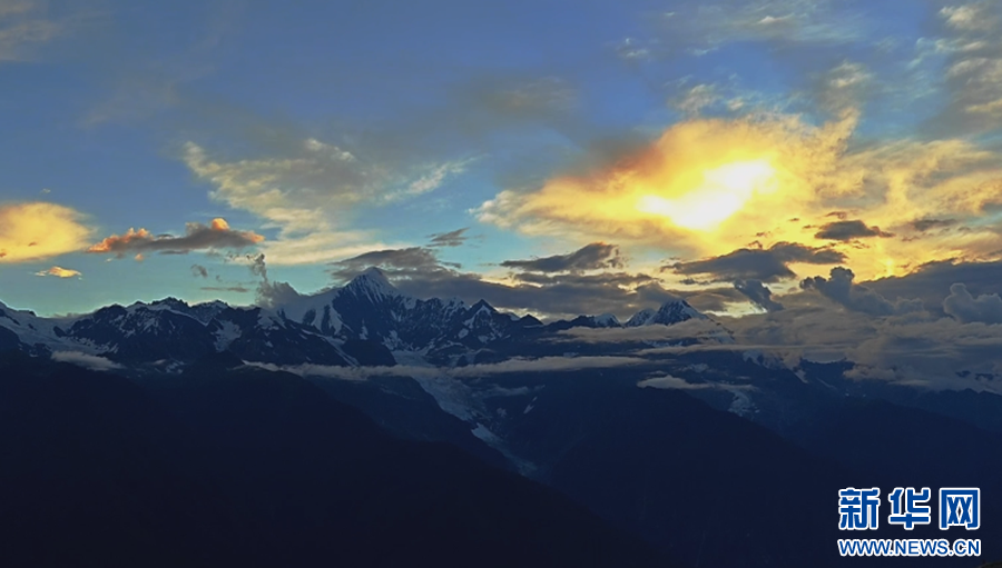 7月28日,攝影師在梅里雪山附近,用延時攝影記錄下梅里雪山的晚霞美景。畫面中,夕陽的光穿過層疊的云層,照耀在梅里雪山的皚皚白雪之上,勾勒出一幅動態的治愈畫卷。(完)(德欽縣融媒體中心 李春雷)