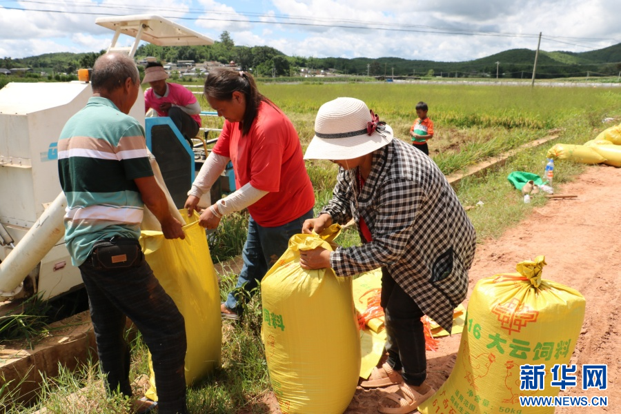 農戶正在收割水稻(8月2日攝)。新華網發(景谷縣融媒體中心供圖)