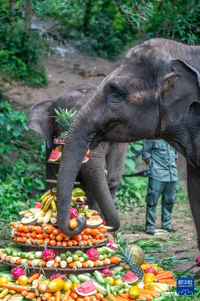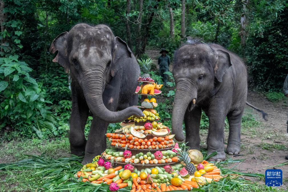 8月12日,野象羊妞(左)和小伙伴龍龍一起品嘗自己的9歲生日宴。新華社記者 胡超 攝