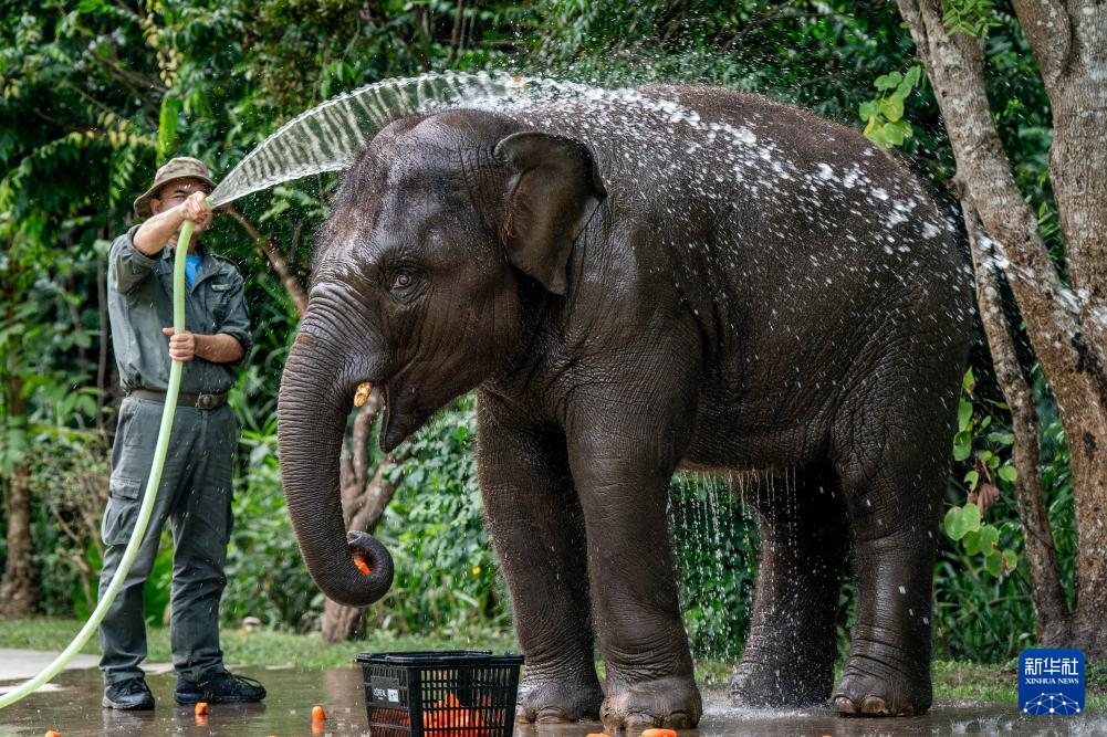 8月8日,“象爸爸”陳繼銘給龍龍洗澡沖涼。新華社記者 胡超 攝