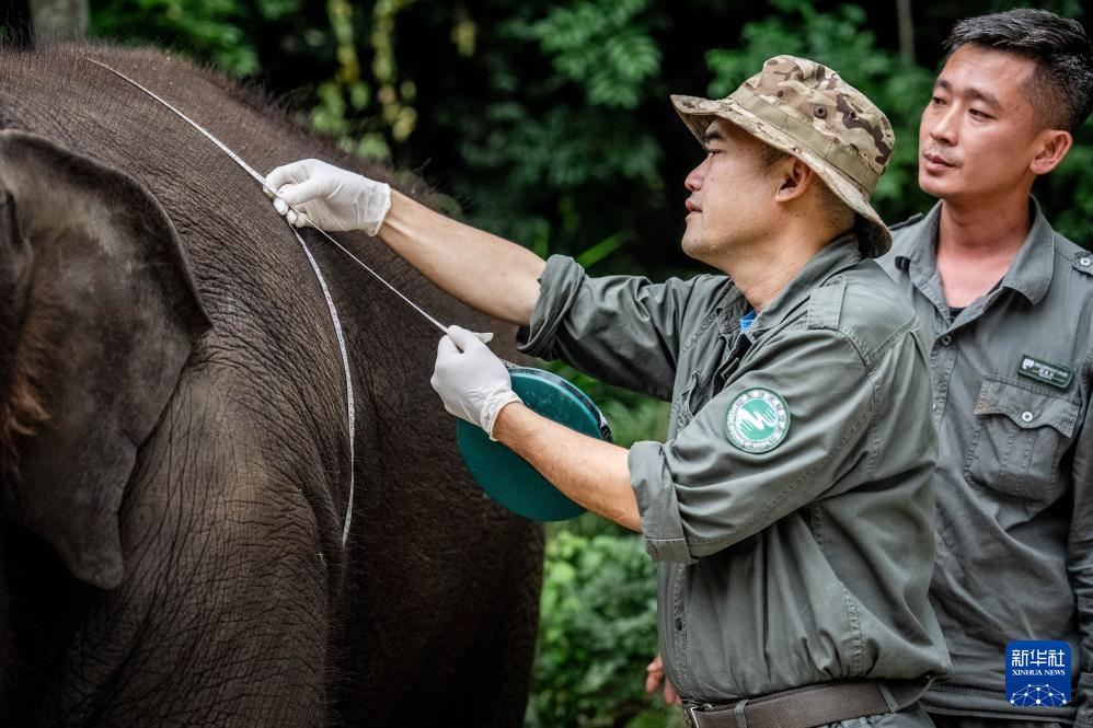 8月8日,“象爸爸”陳繼銘(左)在給龍龍體檢。新華社記者 胡超 攝