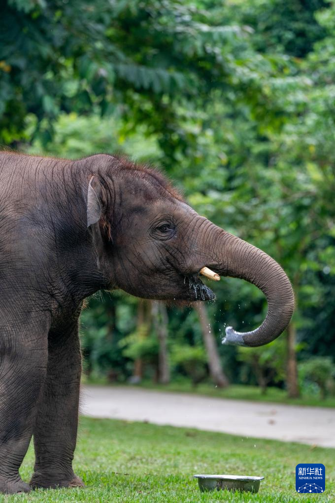 8月8日,野象龍龍在享用羊奶。新華社記者 胡超 攝