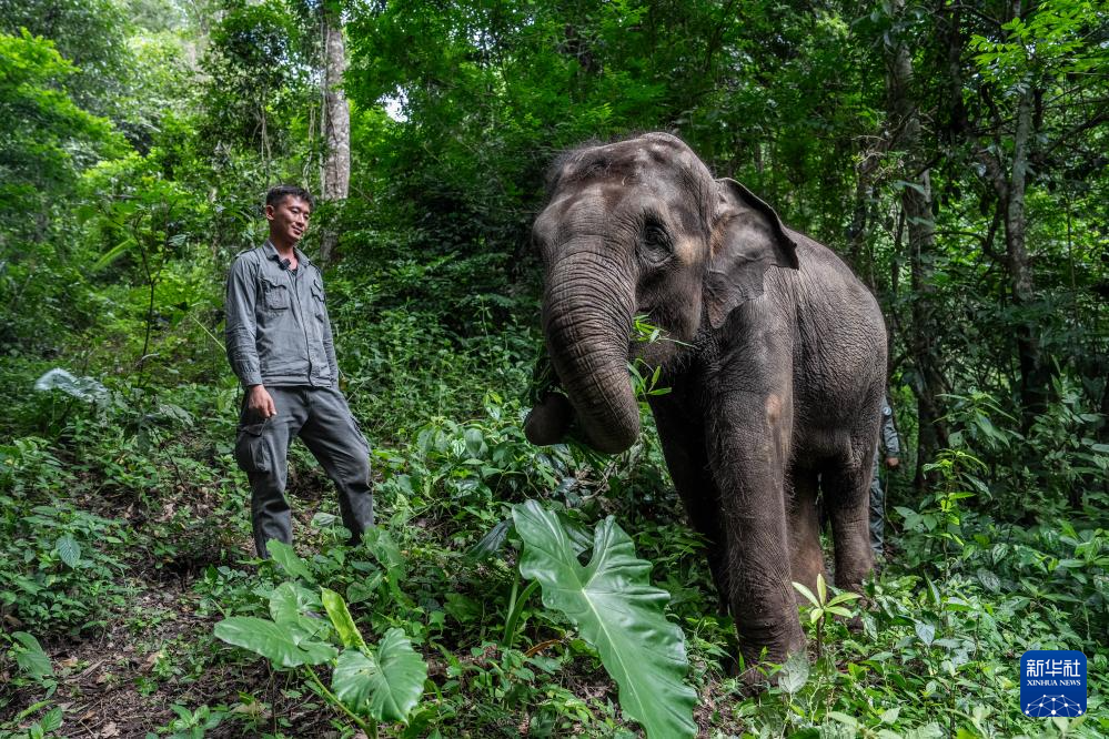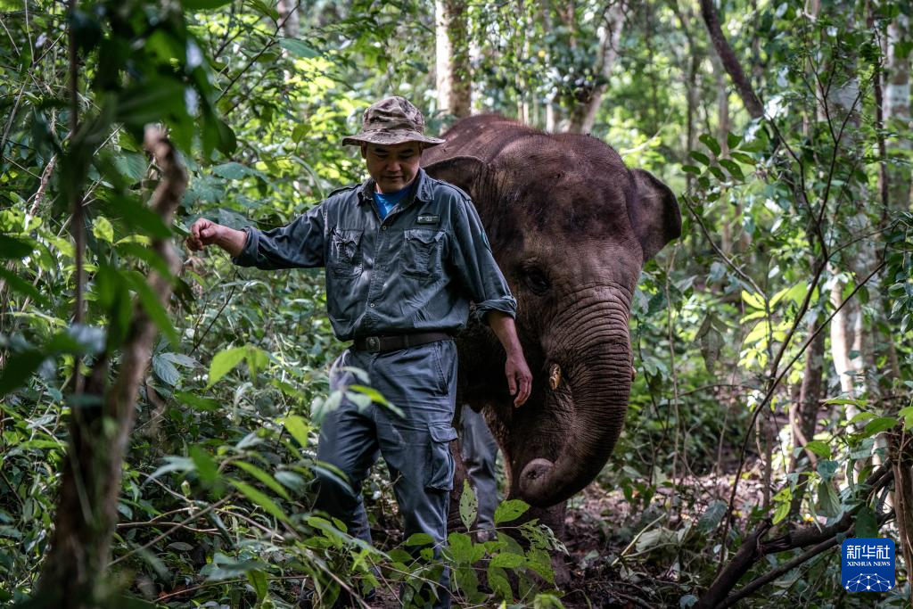 8月5日,“象爸爸”陳繼銘帶龍龍進行野化訓練。新華社記者 胡超 攝