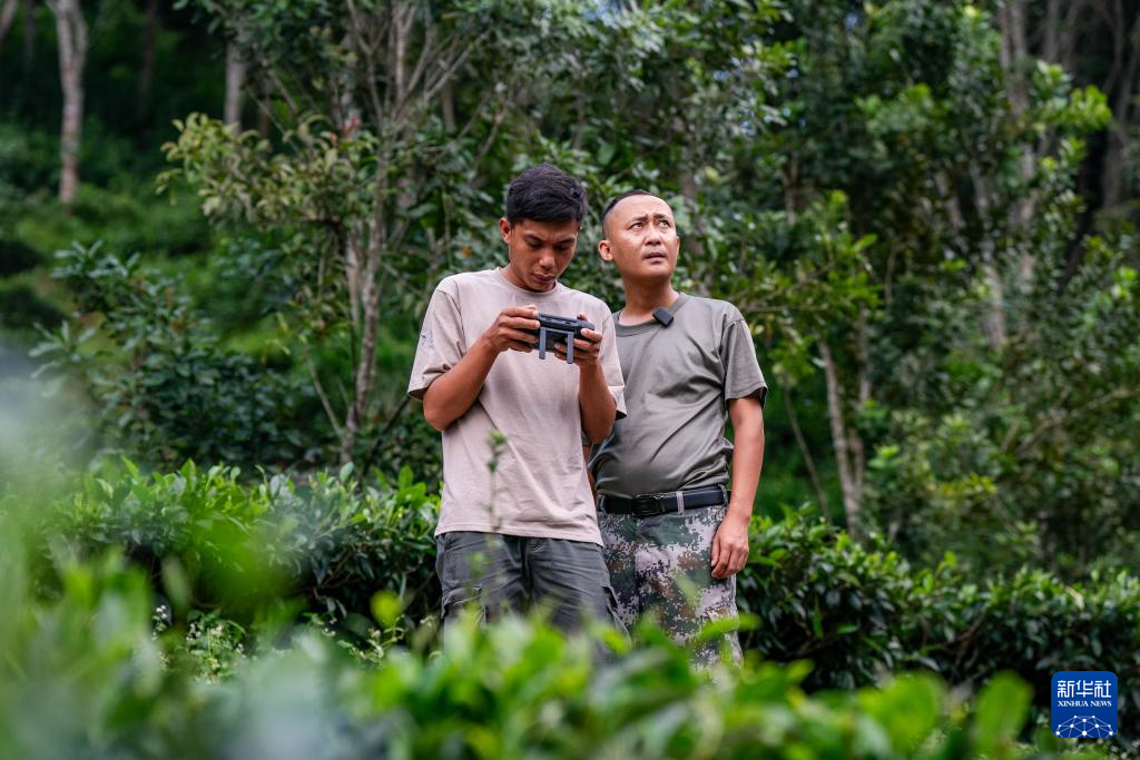 8月10日,亞洲象監測員楊軍(右)和同事在使用無人機監測阿寶的行蹤。新華社記者胡超 攝