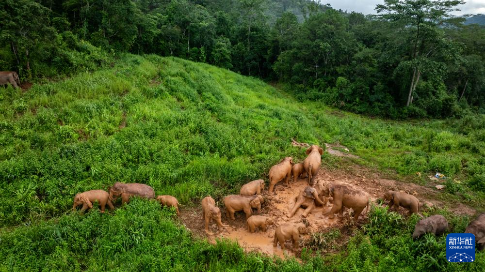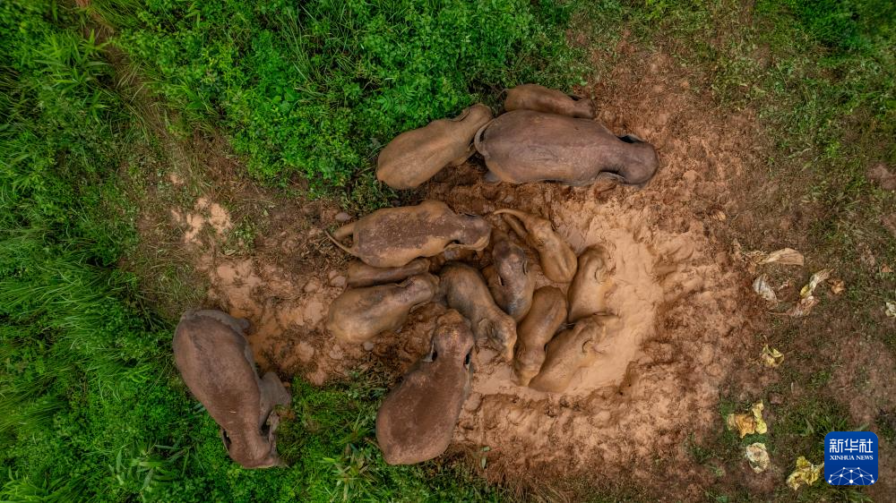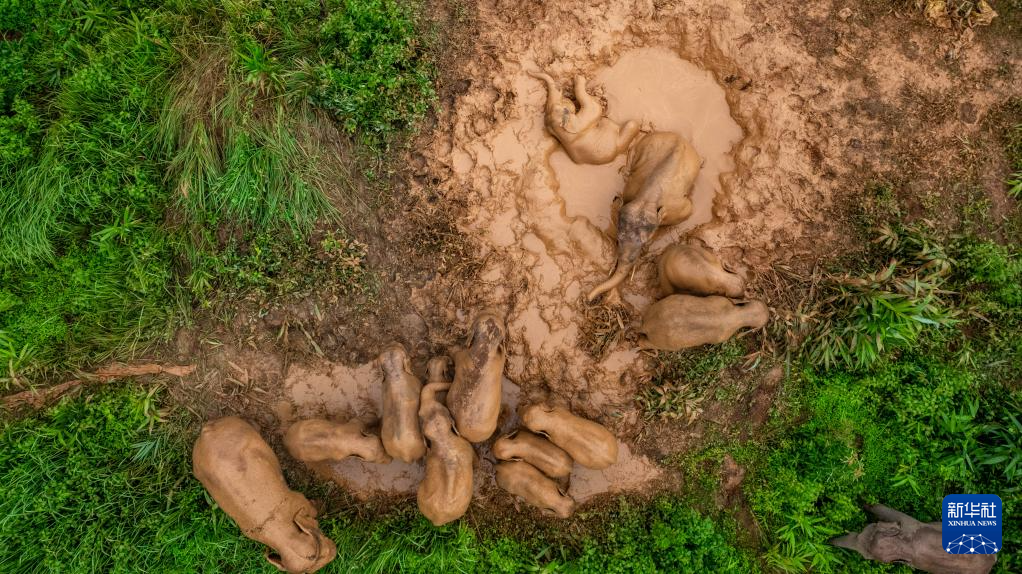 8月8日,“短鼻家族”和“然然家族”的野象在云南省西雙版納州景洪市大渡崗鄉的泥塘里玩耍(無人機照片)。新華社記者 胡超 攝