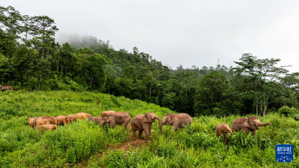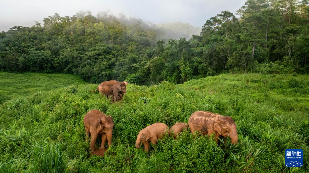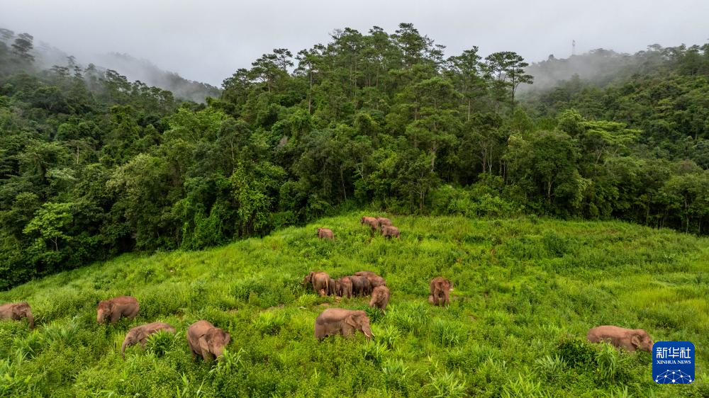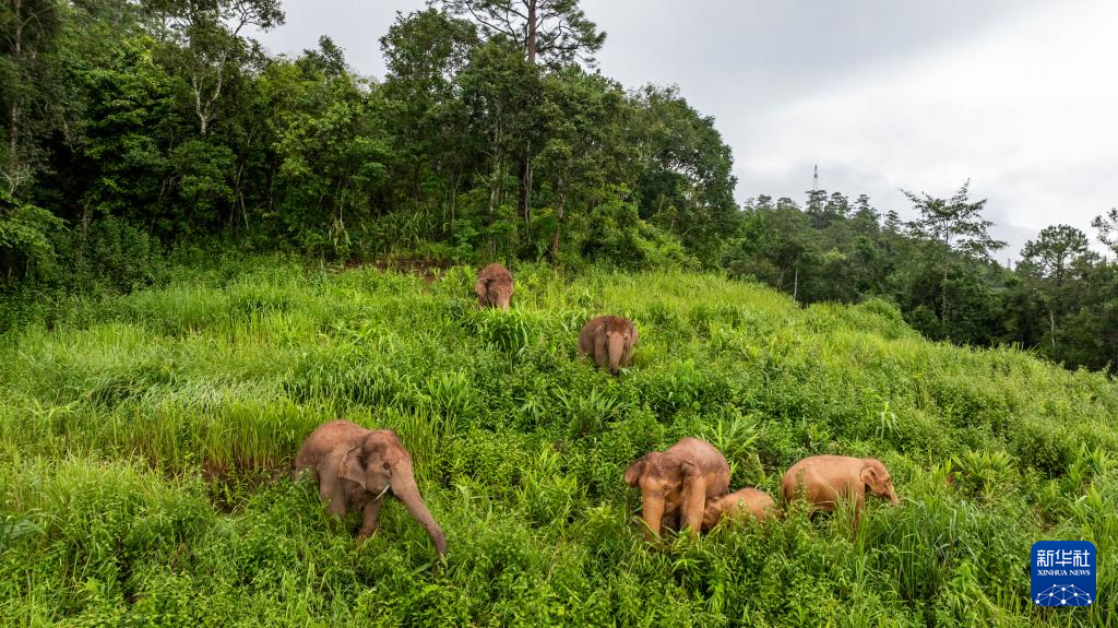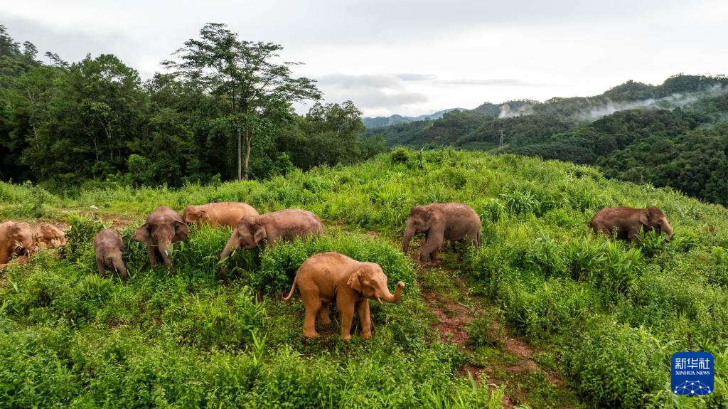 8月8日,“短鼻家族”和“然然家族”的野象在云南省西雙版納州景洪市大渡崗鄉覓食(無人機照片)。新華社記者 胡超 攝