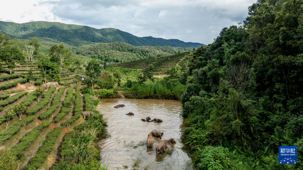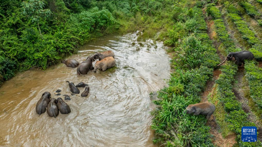 8月8日,“短鼻家族”和“然然家族”的野象在云南省西雙版納州景洪市大渡崗鄉覓食、玩耍(無人機照片)。新華社記者 胡超 攝