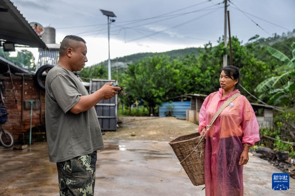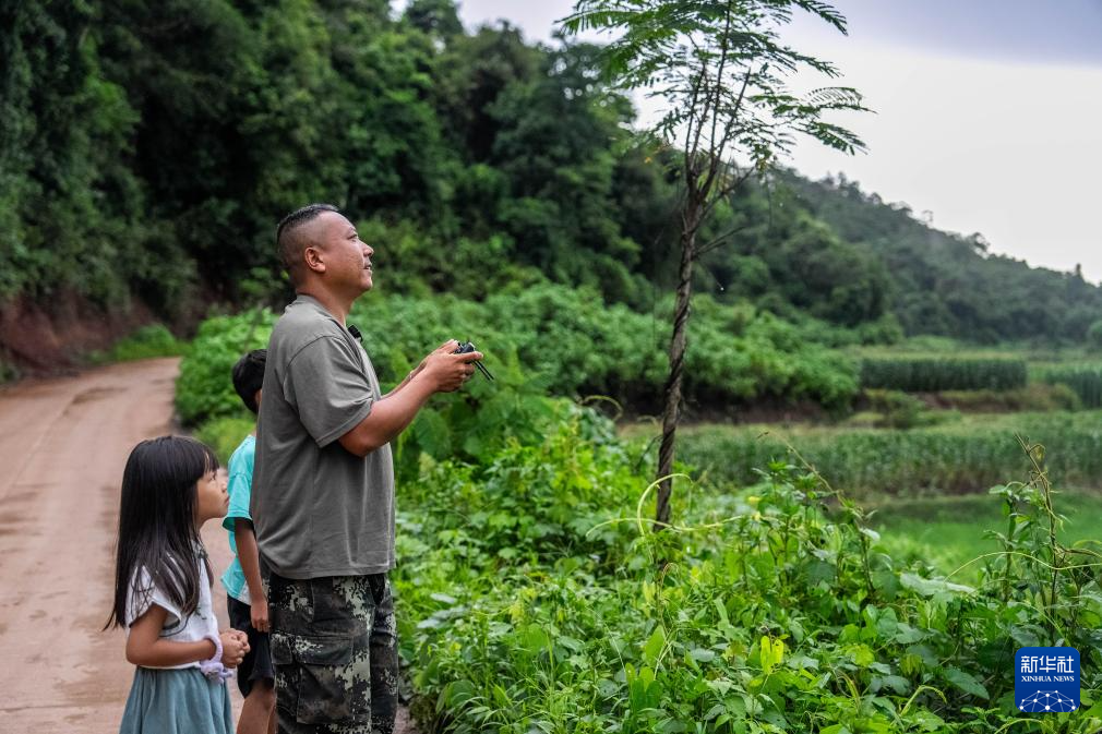 8月8日傍晚,亞洲象監測員彭金福使用無人機監測“短鼻家族”和“然然家族”象群時提醒出行的村民注意安全。新華社記者 胡超 攝