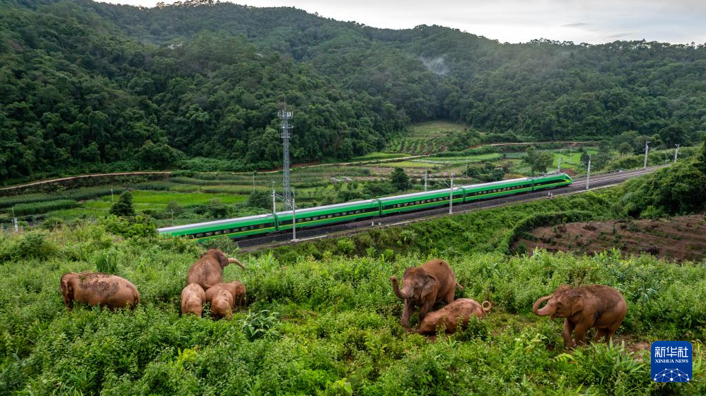 8月8日,“然然家族”和“短鼻家族”象群在云南省西雙版納傣族自治州景洪市大渡崗鄉活動時,一輛復興號列車從山腳下的中老鐵路上駛過(無人機照片)。新華社記者 胡超 攝