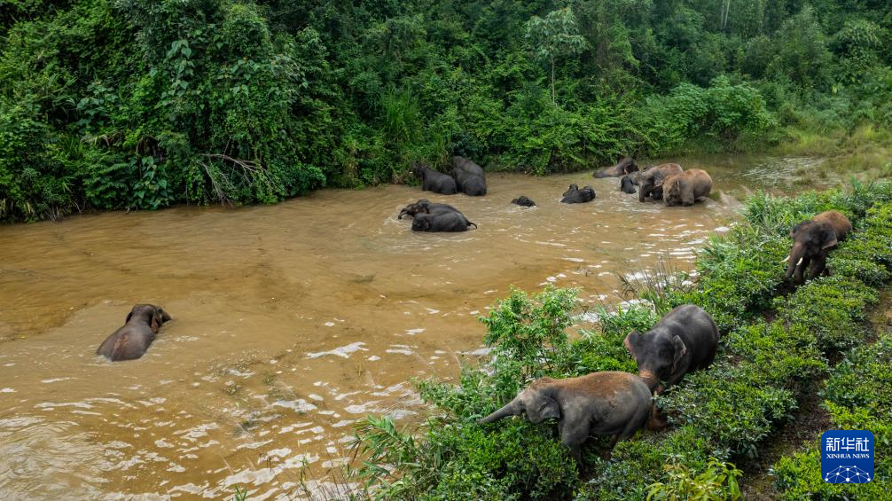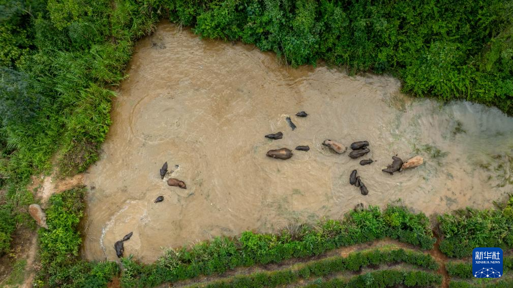 8月7日,在云南省西雙版納傣族自治州景洪市大渡崗鄉,“然然家族”和“短鼻家族”野象在水塘洗澡(無人機照片)。新華社記者 胡超 攝