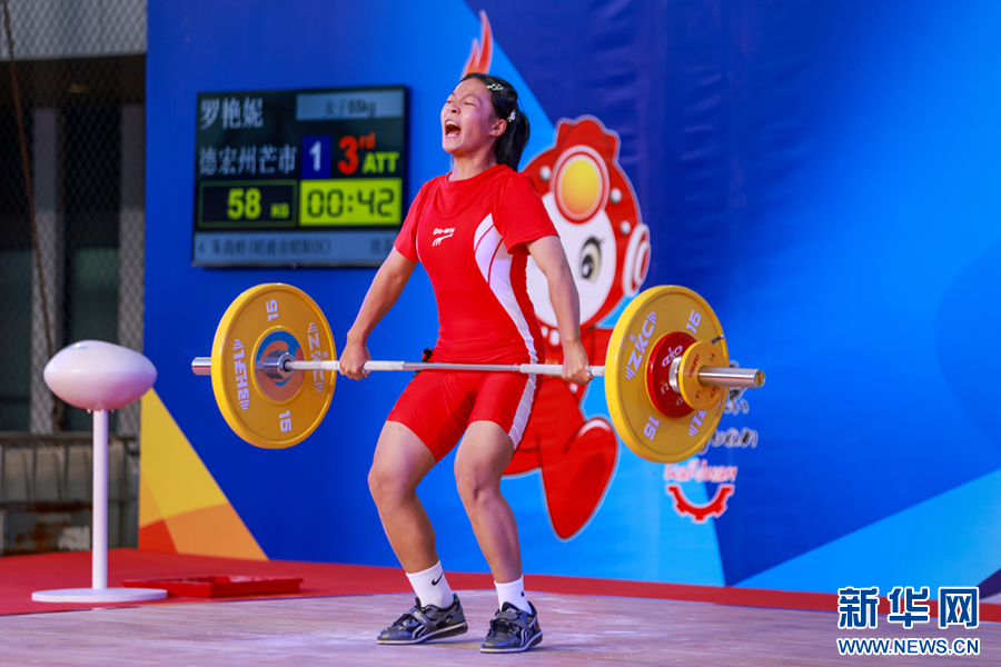 8月13日,舉重項目比賽中,女子組選手在抓舉杠鈴。新華網發(陶家淇 攝)