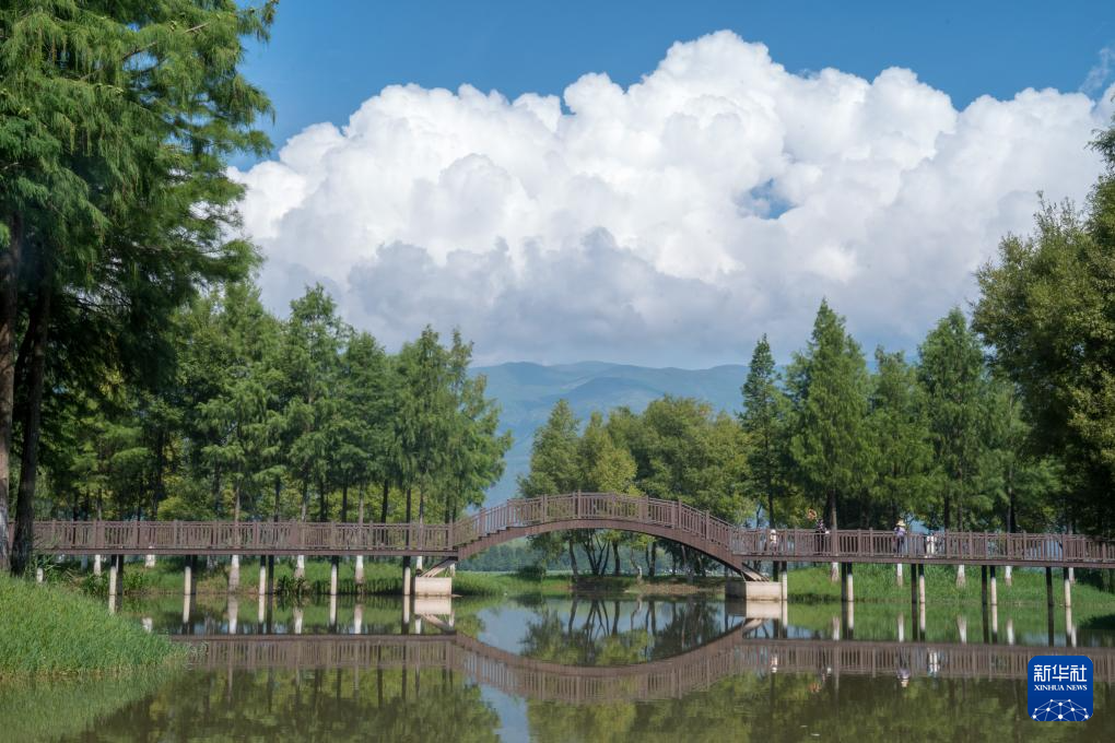 這是8月21日拍攝的茈碧湖彌茨河入湖口處的濕地公園一景。新華社記者 彭奕凱 攝