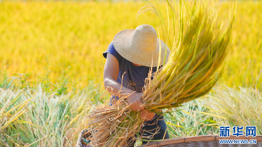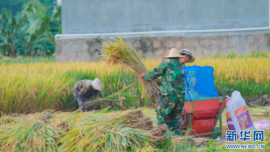 農戶收割水稻(8月15日攝)。新華網發(武定縣融媒體中心供圖)