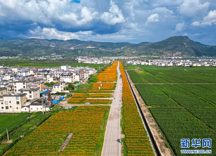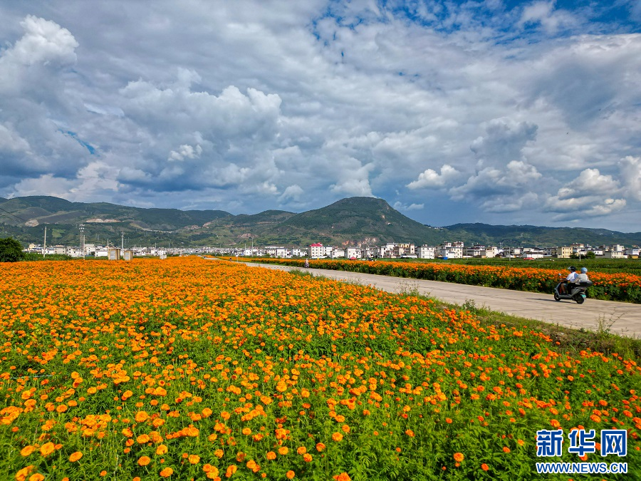 近日,在云南省保山市隆陽區河圖街道,金黃色的萬壽菊競相綻放,將整個河圖壩子裝扮得多姿多彩。(完)(郭康)