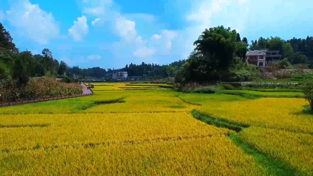 金黃的稻田里白鷺翩飛,與村莊勾勒出一幅山村田園秋色畫卷,美不勝收。