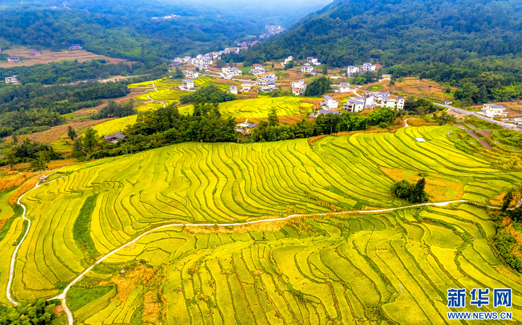 金黃的稻田同道路、民居相互映襯,呈現一幅和美鄉村豐收畫卷(8月31日攝)。新華網發(曾三東 攝)