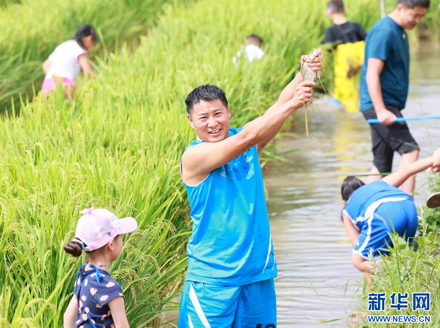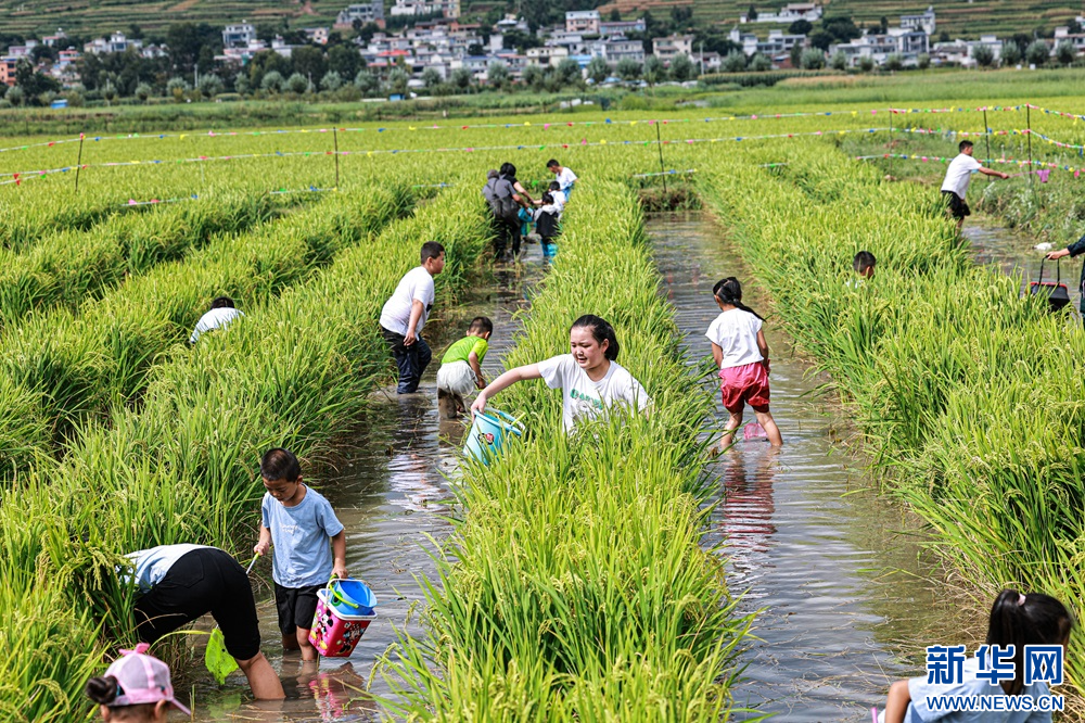 各地跑友體驗稻田摸魚捉蝦活動(9月8日攝)。新華網發(博捷體育供圖)
