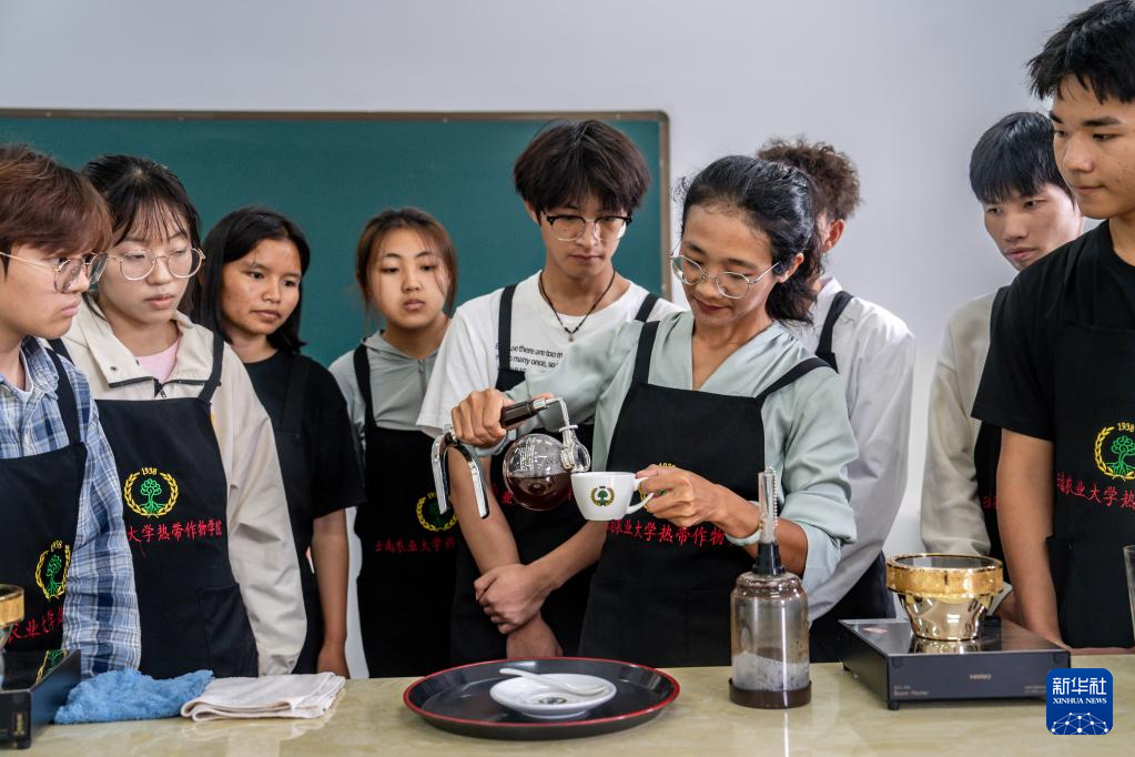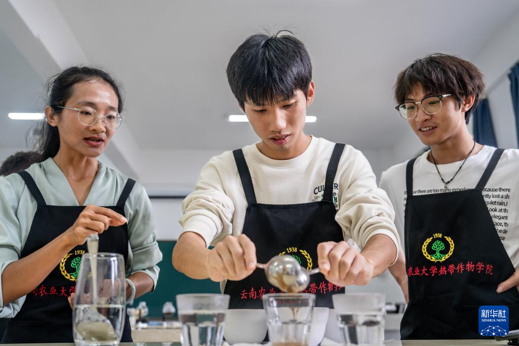9月10日,云南農業大學熱帶作物學院教師陳云蘭(右三)在給咖啡專業的學生上咖啡認知課。
