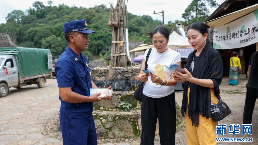 吳金良給游客發農村消防安全知識手冊(8月12日攝)。新華網發 李浩 攝