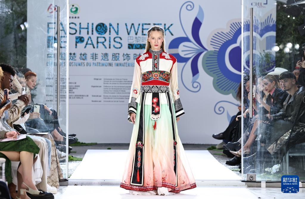 9月26日,模特在法國巴黎舉行的中國楚雄非遺服飾時裝展上展示時裝。新華社記者高靜攝