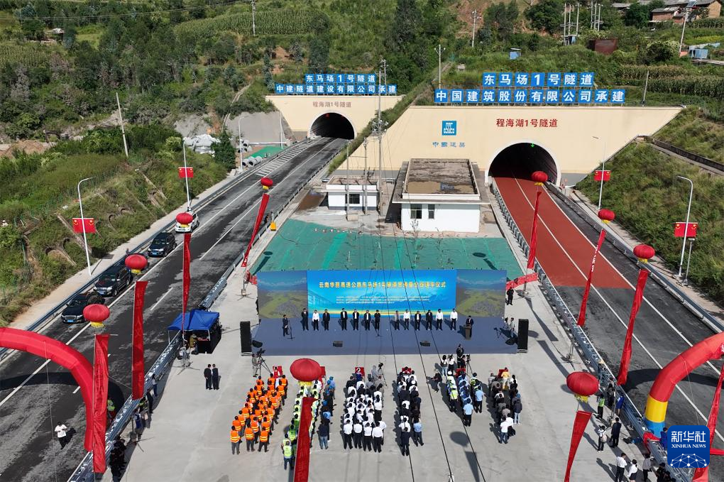 9月28日,云南華麗高速公路全線通車儀式在程海湖1號隧道(原“東馬場1號隧道”)舉行(無人機照片)。新華社發(陳輝 攝)