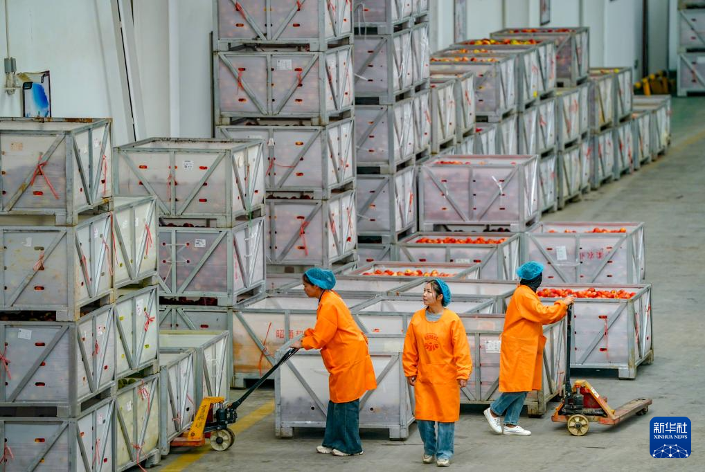 9月29日,工作人員在昭通市超越蘋果基地蘋果分選車間內運蘋果。新華社記者 陳欣波 攝