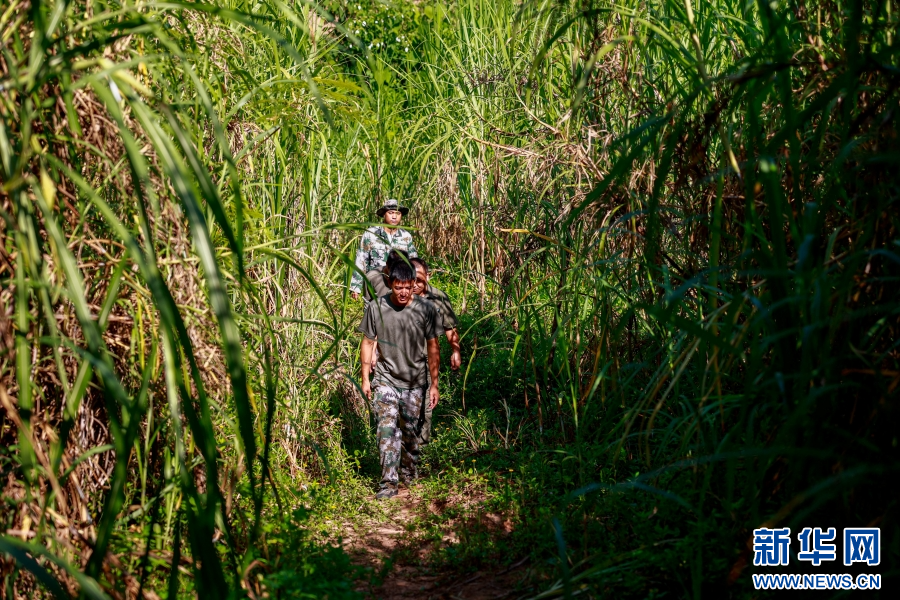 李紅江和同事們在野外監測亞洲象活動的痕跡(7月27日攝)。新華網發 徐華陵 攝