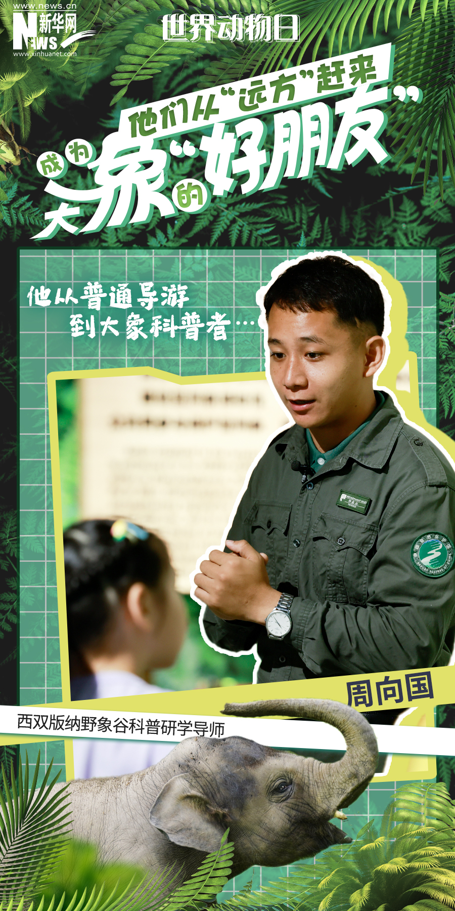 公眾對亞洲象的喜愛程度不斷上升,參加研學的學生也越來越多,對周向國的工作提出了更高的要求。從一名普通向導,到專業的科普研學導師,他希望一個個以亞洲象為核心的研學課程讓更多孩子了解亞洲象,了解保護熱帶雨林的重要意義,從小樹立起保護亞洲象的理念。