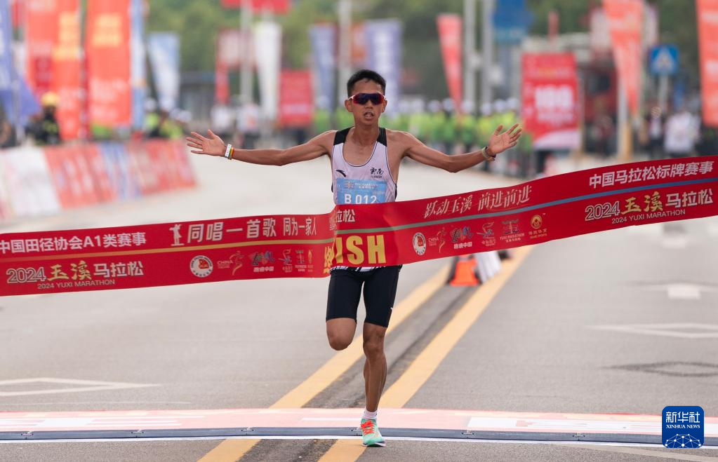 10月5日,選手楊定宏在比賽中沖過終點。最終,他獲得馬拉松男子組冠軍。新華社記者 陳欣波 攝
