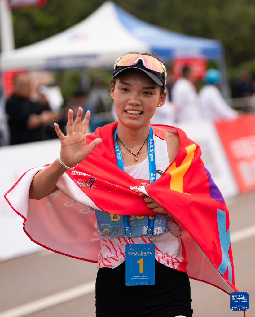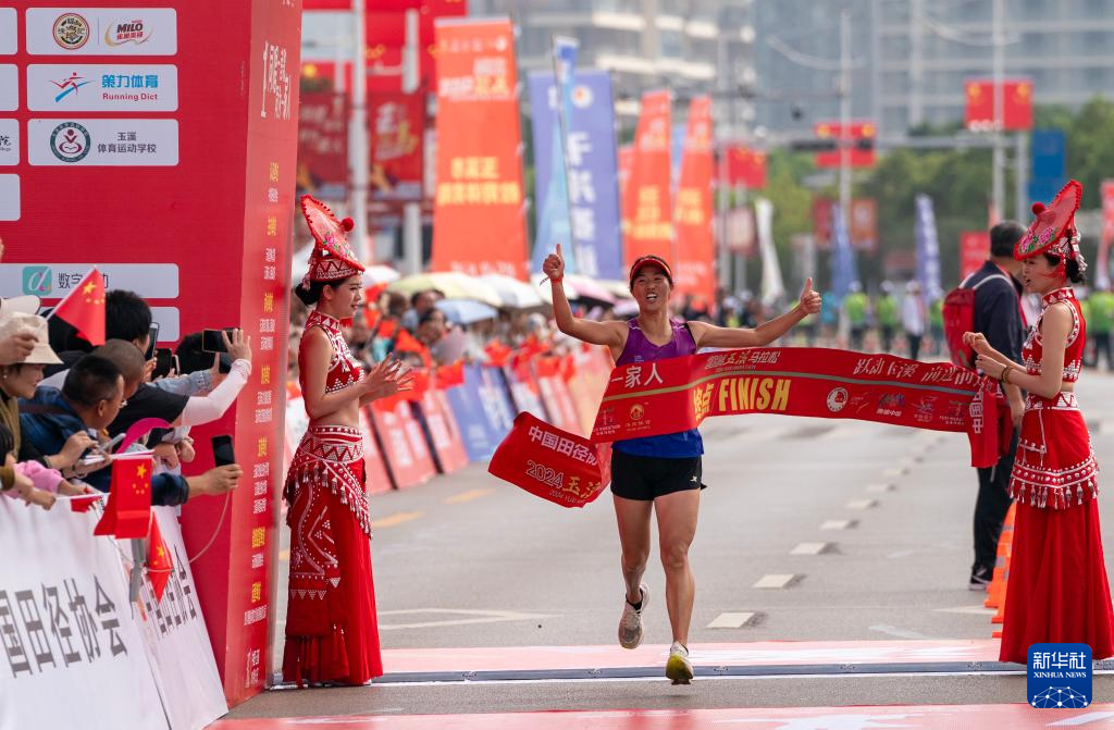 10月5日,選手楊定榮在比賽中沖過終點。最終,她獲得馬拉松女子組冠軍。新華社記者 陳欣波 攝