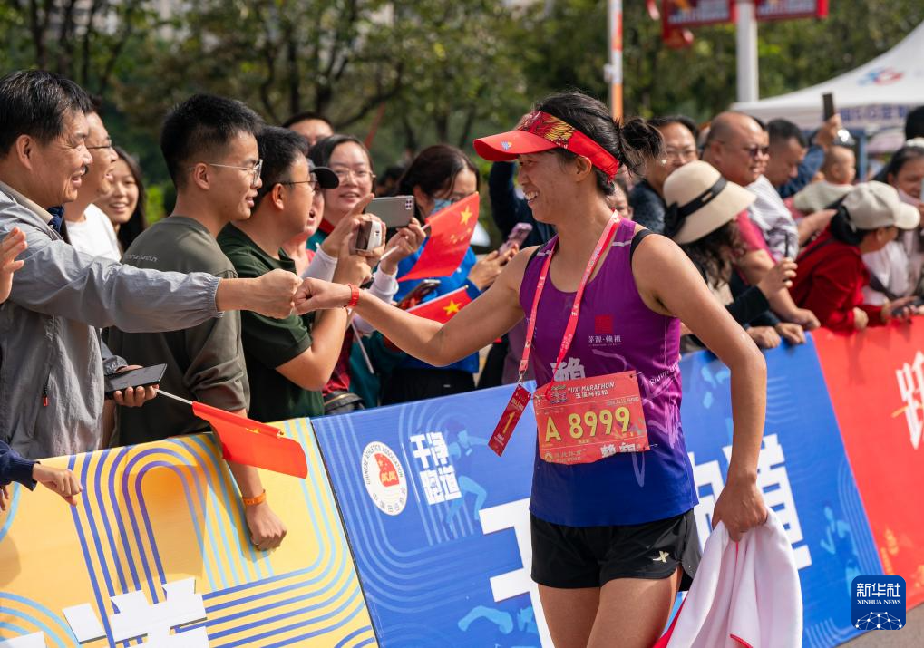 10月5日,馬拉松女子組冠軍楊定榮在比賽后與場邊觀眾互動。新華社記者 陳欣波 攝