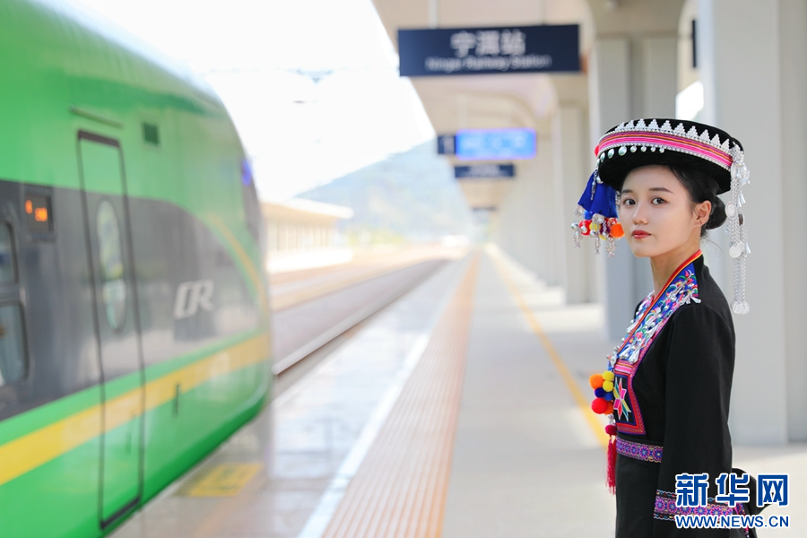 中老鐵路寧洱站站臺,身著民族服飾的列車工作人員(資料圖)。新華網發(楊紫軒 攝)