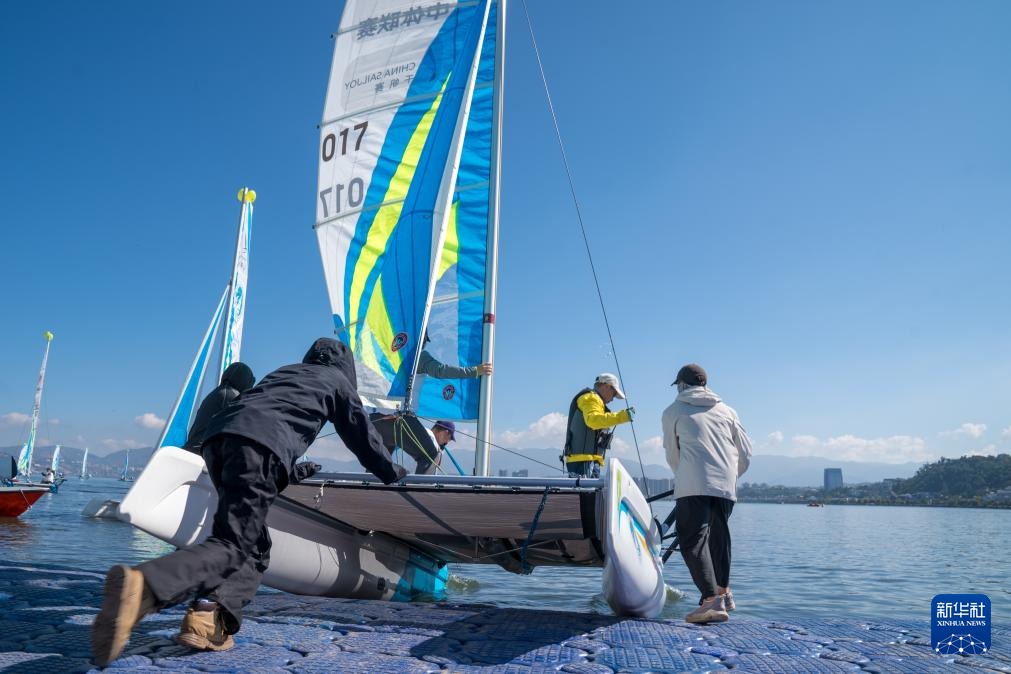 10月26日,參加中國萬水千帆賽(大理站)比賽的船只從出發點下水。新華社記者 彭奕凱 攝