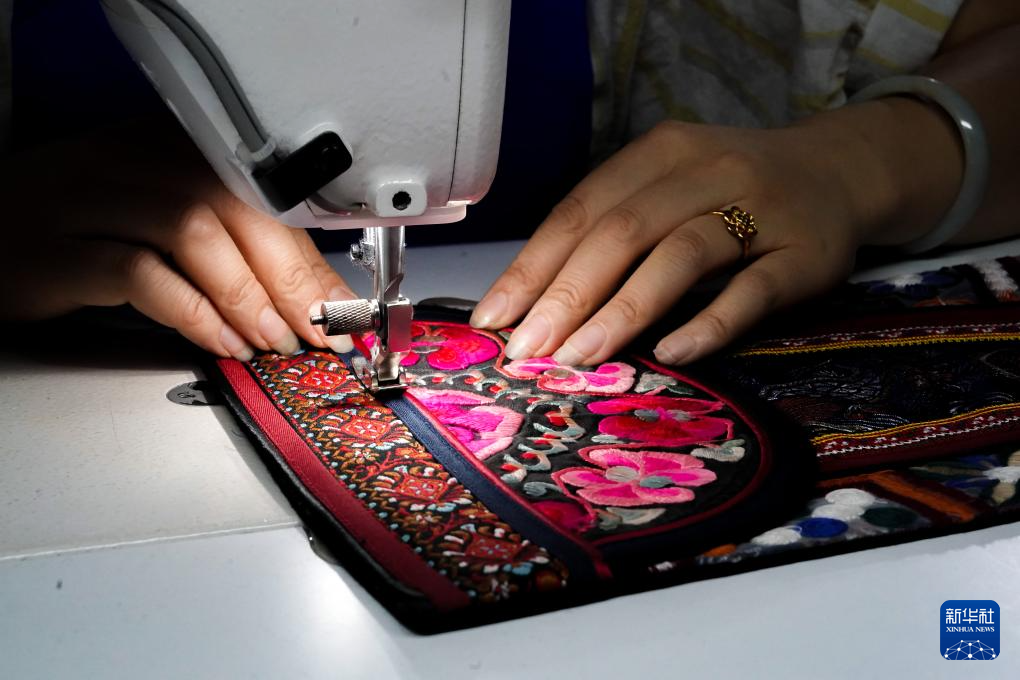 9月7日,國家級非物質文化遺產代表性項目彝族服飾州級代表性傳承人盧潔瑩在自己云南楚雄的工作室內制作繡品。盧潔瑩是赴巴黎參展彝族服飾作品的設計師之一。新華社記者 江文耀 攝