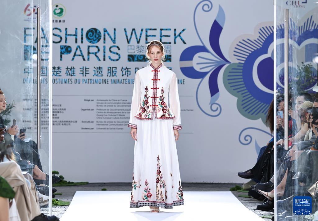 9月26日,模特在法國巴黎舉行的中國楚雄非遺服飾時裝展上展示時裝。新華社記者 高靜 攝