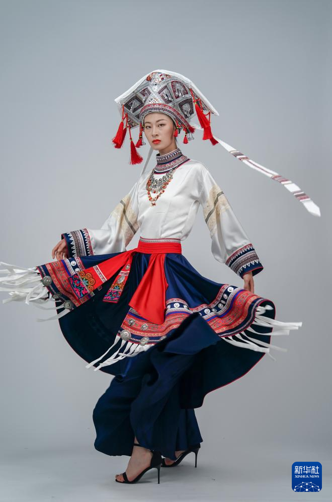 8月27日,在昆明一處攝影棚內,模特身穿將赴巴黎參展的彝繡服飾拍攝定妝照。新華社記者 陳欣波 攝