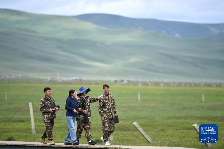 在位于甘肅省甘南藏族自治州的尕海則岔國家級自然保護區,管護中心尕海保護站的工作人員在保護區內巡護(2023年7月7日攝)。新華社記者陳斌 攝