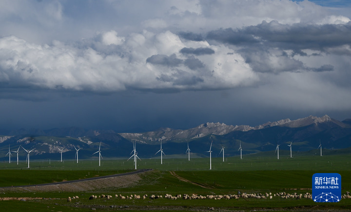 羊群在青海省海西蒙古族藏族自治州天峻草原的一處風電場附近漫步、吃草。新華社記者張龍 攝