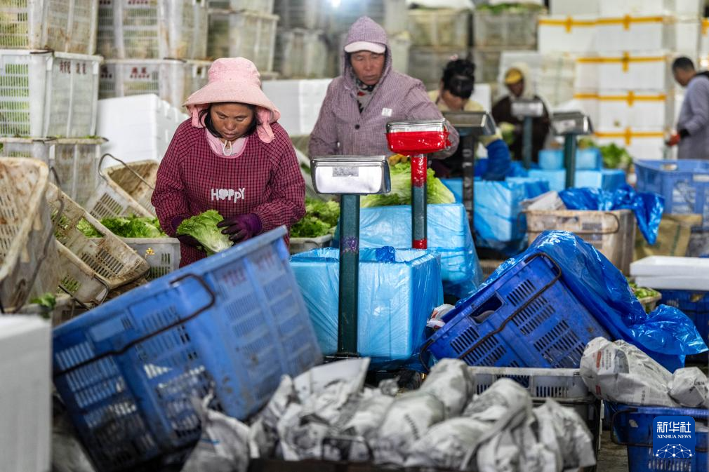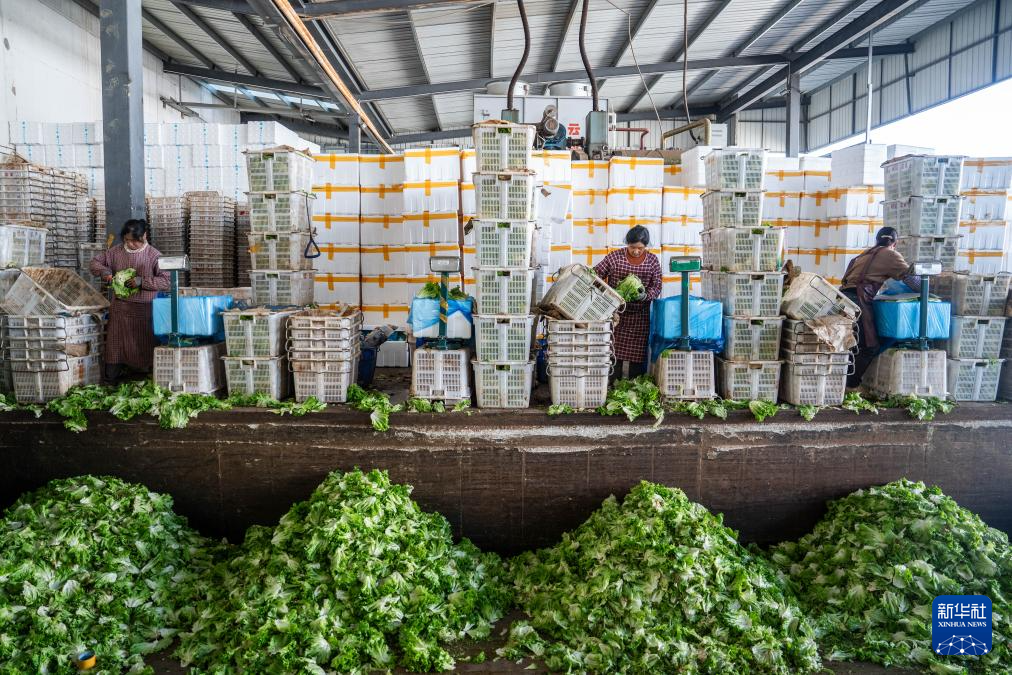 11月13日,菜農在曲靖市麒麟區越州鎮冷鏈物流產業園分揀生菜。新華社記者 胡超 攝